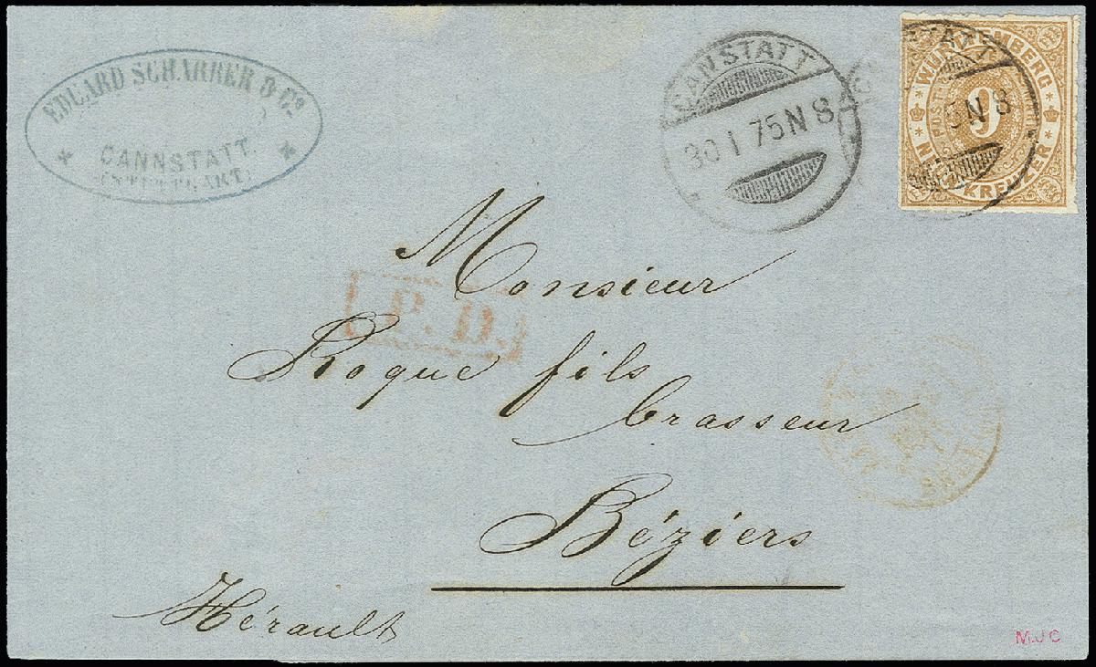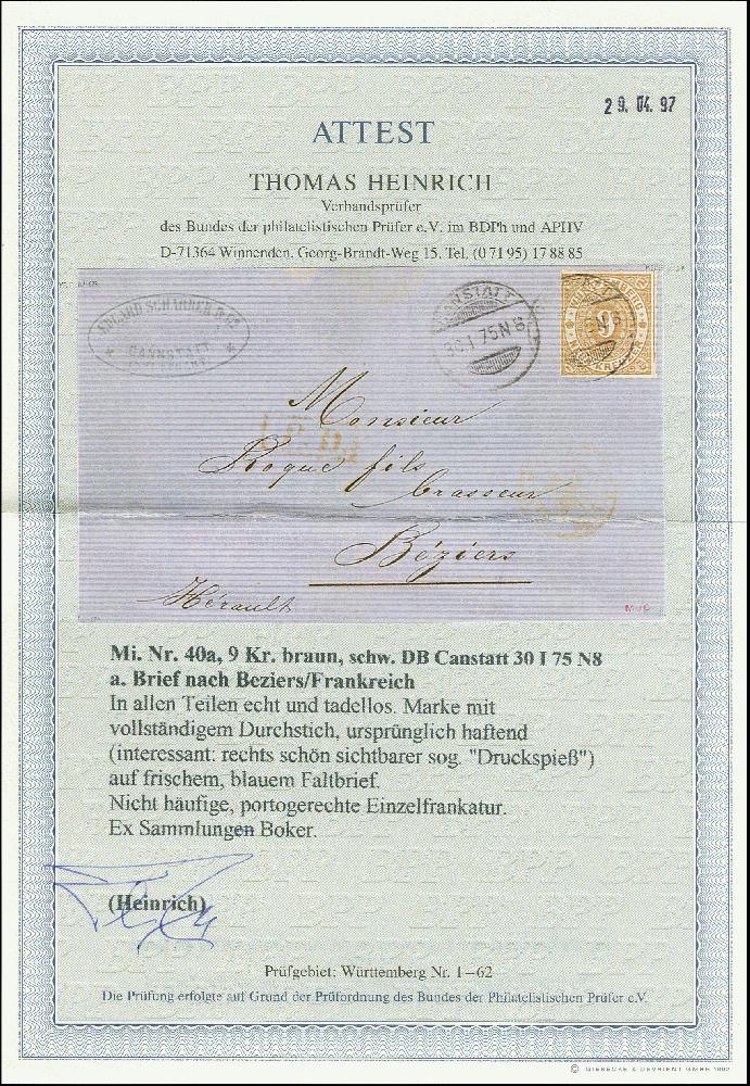 | Zusatzinformationen und Suchstichworte: | 368. Auktion Heinrich Köhler 26.-30. März 2019 Los 3542 9 Kr. braun mit langem Druckspieß im rechten Rand, farbfrisch und tadellos durchstochen mit sauber auf- und nebengesetztem "CANSTATT 30 1 75" auf Briefhülle nach Frankreich, eine besonders schöne Einzelfrankatur, Fotoattest Heinrich BPP (1997) Zuschlag 600,00 EUR |