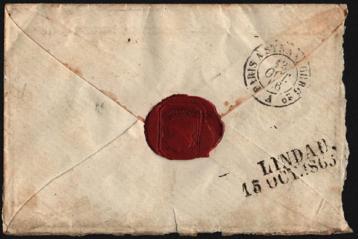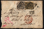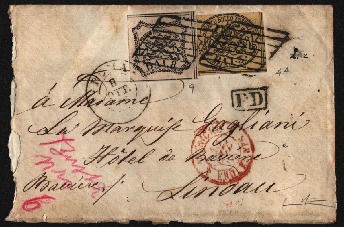 | Zusatzinformationen und Suchstichworte: | Versuch einer Übersetzung: Kirchenstaat: direkte Korrespondenz mit den deutschen Staaten 8.10.1866, Briefumschlag von Rom nach Lindau (Bayern), frankiert mit 11 Baj. mit 3 Baj. chromgelb + 8 Baj. weiß, jeweils gestempelt mit dem stummen Rautenstempel, mit dem Doppelkreis "ROMA 8 OTT 66" auf der Seite, dem quadratischen Stempel "PD" und dem doppelten roten französischen Einkreis (über Land) "AUTRICHE 2 ERQUELINES 2 12 OCT 66". Rückseitiger Ankunftsstempel von Lindau vom 15. Oktober. Einfaches Porto frei Bestimmungsort (Französische Vermittlungsgebühr) bis 10 Gramm (Französisch-Päpstliche Konvention vom 1. Oktober 1853 / Währungsumrechnung von 1866). Sassone-Nr. 4A, 9 Brief mit originalen Briefmarken und Stempeln. |