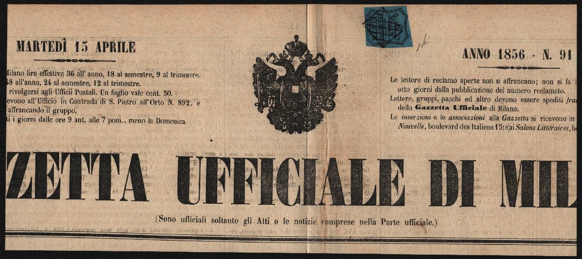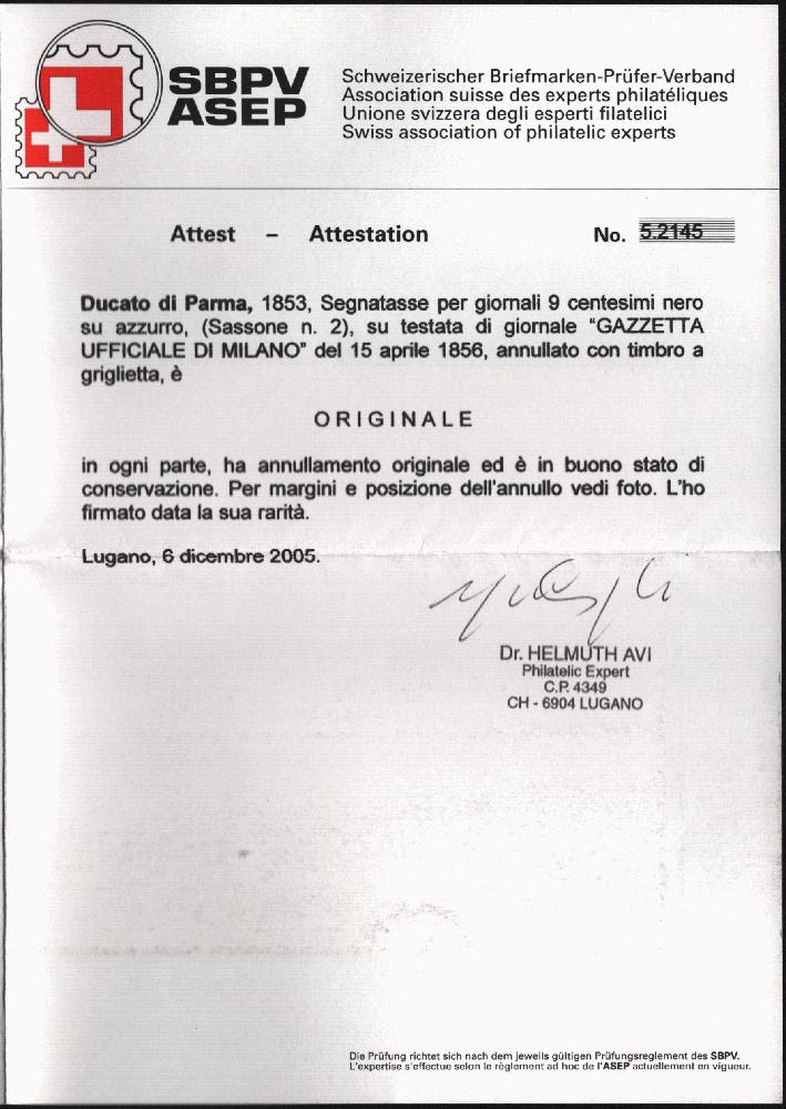 | Zusatzinformationen und Suchstichworte: | Versuch einer Übersetzung: Herzogtum Parma, 1853, Porto für Zeitungen 9 Cent, schwarz auf blau, (Sassone Nr. 2), auf der Zeitung "GAZZETTA UFFICIALE DI MILANO" vom 15. April 1856, gestempelt mit Gitterstempel, ist in allen Teilen ORIGINAL, hat Original Entwertung und ist in gutem Zustand. Ränder und Position des Stempels siehe Foto. Ich habe es wegen seiner Seltenheit signiert. |