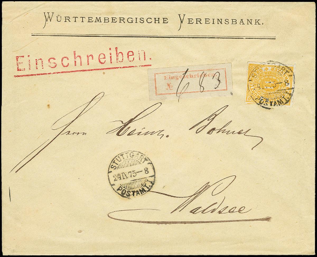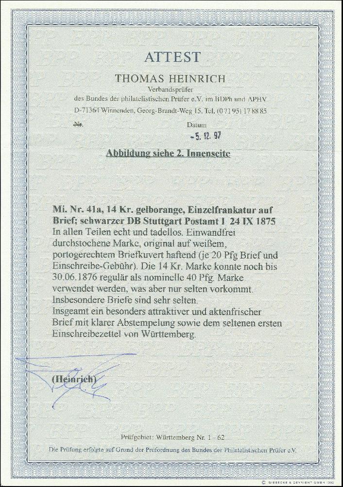 | Zusatzinformationen und Suchstichworte: | 368. Auktion Heinrich Köhler 26.-30. März 2019 Los 3543 14 Kr. gelborange, farbfrisch und einwandfrei durchstochen, als 40 Pfg. Marke benutzt mit klar auf- und nebengesetztem "STUTTGART 24 IX 75" auf Bank-R-Brief mit seltenem ersten R-Zettel nach Waldsee; eine besonders attraktive und in dieser Form sehr seltene Einzelfrankatur, Fotoattest Heinrich BPP (1997) Zuschlag 800,00 EUR |