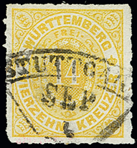 | Zusatzinformationen und Suchstichworte: | 368. Auktion Heinrich Köhler 26.-30. März 2019 Los 3544 14 Kr. zitronengelb, schöne frische Farbe und gut durchstochen, zentrisch entwertet durch schwarzen Fächerstempel von Stuttgart, Kabinett, sign. Richter und Unverferth sowie Fotoattest Thoma BPP (1996) Zuschlag 600,00 EUR |