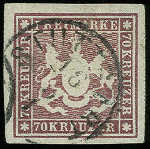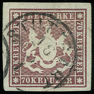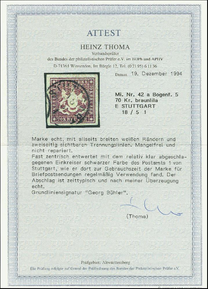 | Zusatzinformationen und Suchstichworte: | 368. Auktion Heinrich Köhler 26.-30. März 2019 Los 3545 70 Kr. violettbraun, farbfrisch und allseits breitrandig mit leicht und fast kpl. aufgesetztem EKr. "STUTTGART 18/5", Pracht, sign. Georg Bühler und Fotoattest Thoma BPP (1994) Ausruf 1.800,00 EUR |