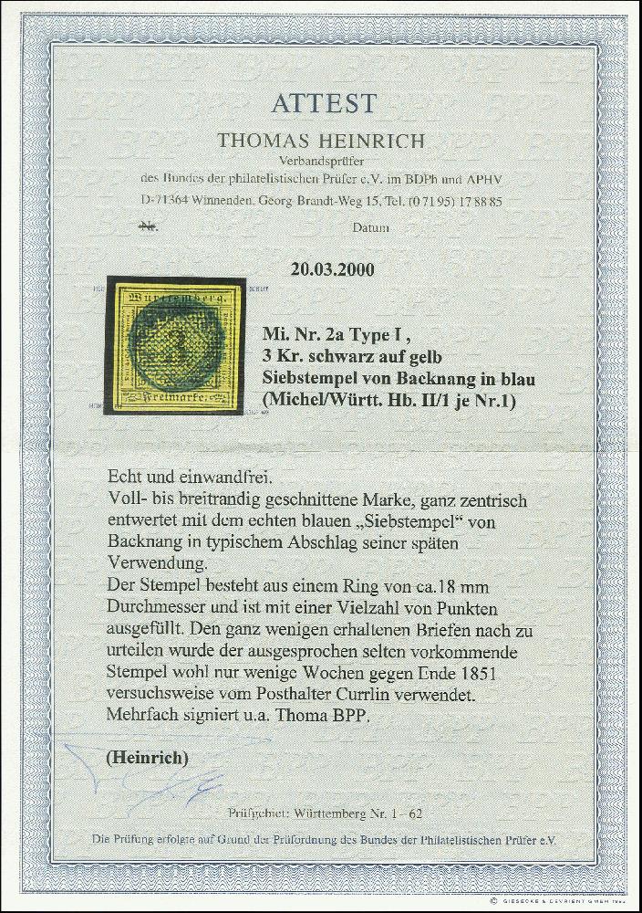 | Prüfer: | Heinrich, Thomas (BPP (Bund Philatelistischer Prüfer)) |