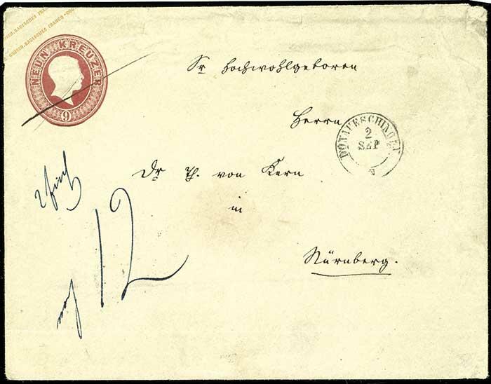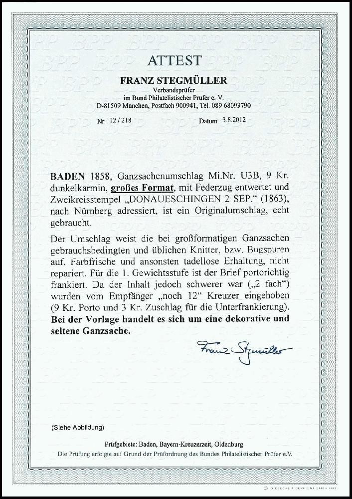 | Zusatzinformationen und Suchstichworte: | Dr. Reinhard Fischer 188. Auktion 1. - 3. September 2022 Los 1328 Altdeutschland Baden 9 Kreuzer dunkelkarmin, großes Format, entwertet mit Federzug und nebengesetztem Orts-K2 Donaueschingen 2 Sep" (1863) nach Nürnberg, für die 1 Gewichtsstufe war das 9 Kreuzer Porto des Ganzsachenumschlages ausreichend, da der Inhalt jedoch schwerer war (2 fach) wurden vom Empfänger noch 12 Kreuzer eingehoben (9 Kreuzer Porto und 3 Kreuzer Zuschlag für die Unterfrankierung), der Umschlag weist die bei großformatigen Ganzsachen gebrauchsbedingten und üblichen Knitter bzw. Bugspuren auf, ansonsten farbfrische und tadellose Erhaltung, Fotoattest Stegmüller BPP: "Bei der Vorlage handelt es sich um eine dekorative und seltene Ganzsache." Zuschlag 240,00 EUR |