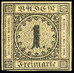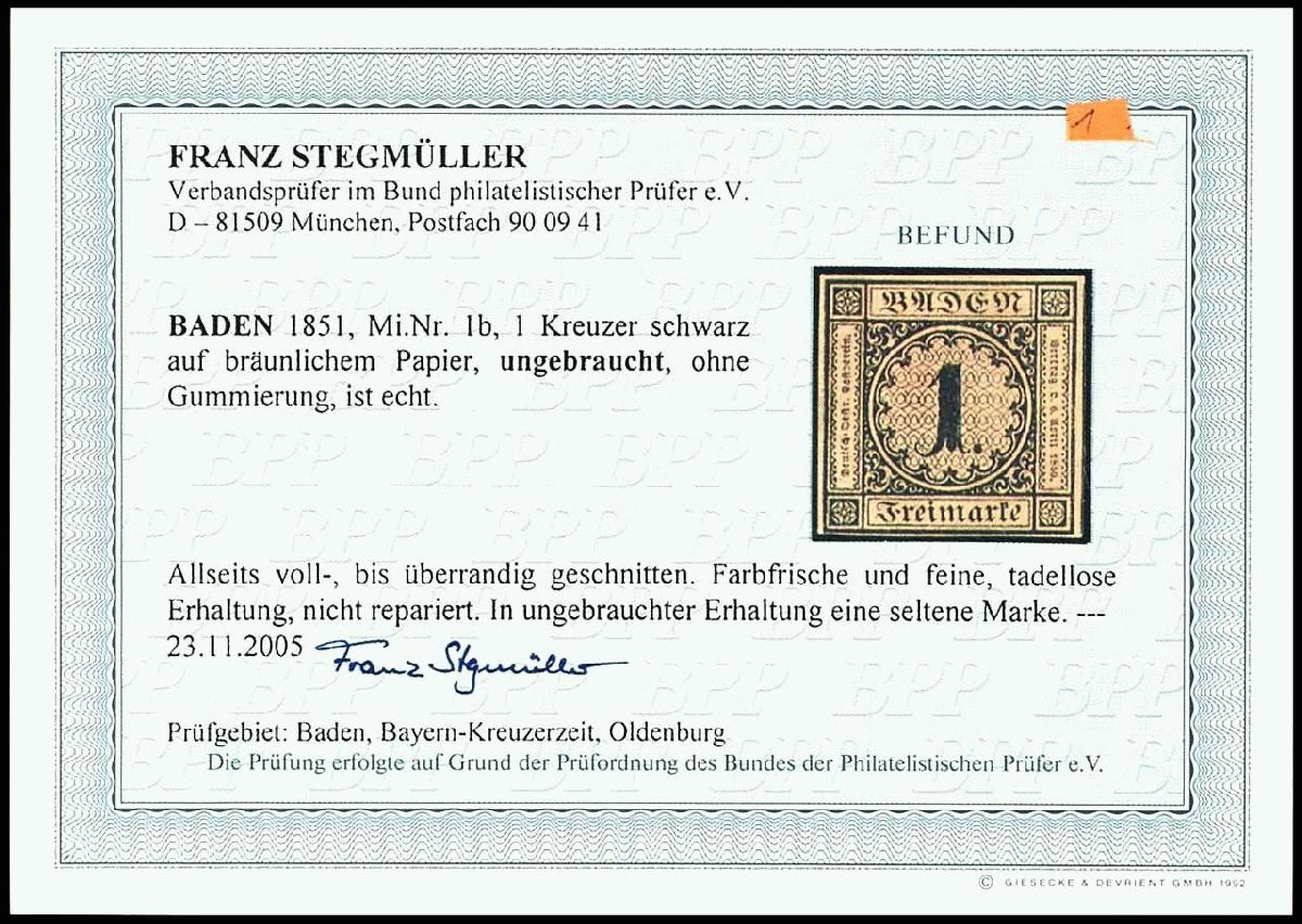 | Zusatzinformationen und Suchstichworte: | Dr. Reinhard Fischer 188. Auktion 1. - 3. September 2022 Los 1329 Altdeutschland Baden 1 Kreuzer schwarz auf bräunlichem Papier, voll bis breitrandiges und farbfrisches Kabinettstück, ungebraucht ohne Gummierung, Fotobefund Stegmüller BPP: "In ungebrauchter Erhaltung eine seltene Marke.", Mi. 350.- Zuschlag 280,00 EUR |