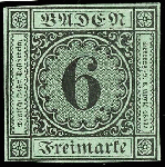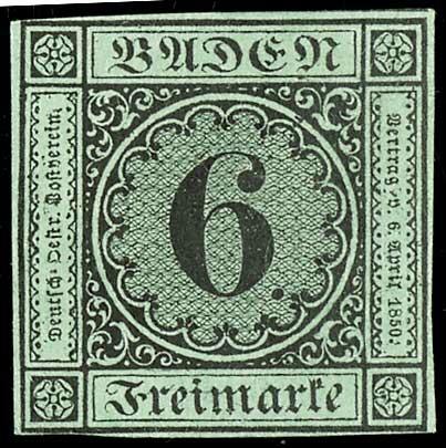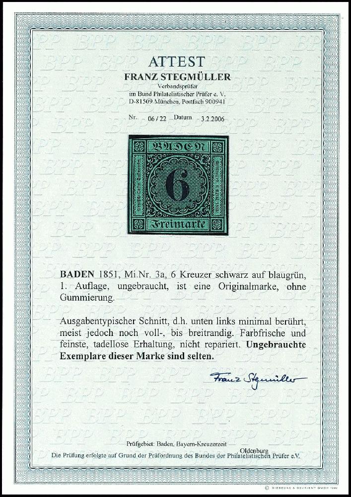 | Zusatzinformationen und Suchstichworte: | Dr. Reinhard Fischer 188. Auktion 1. - 3. September 2022 Los 1331 Altdeutschland Baden 6 Kreuzer schwarz auf blaugrün, die seltene 1. Auflage in ungebrauchter Erhaltung, ohne Gummierung, ausgabetypischer Schnitt d. h. unten links minimal berührt, meist jedoch noch voll bis breitrandig, farbfrische und feinste, tadellose Erhaltung, Fotoattest Stegmüller BPP: "Ungebrauchte Exemplare dieser Marke sind selten.", Mi. 2.800.- - kaum einmal angebotene Altdeutschland-Seltenheit in ungebrauchter Erhaltung! Zuschlag 1.000,00 EUR |