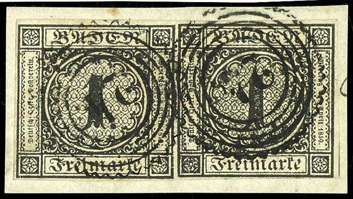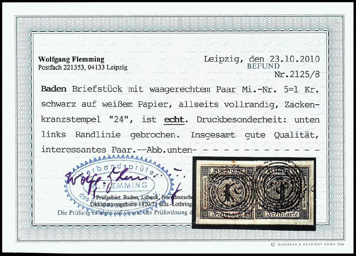 | Zusatzinformationen und Suchstichworte: | Dr. Reinhard Fischer 188. Auktion 1. - 3. September 2022 Los 1333 Altdeutschland Baden 1 Kreuzer schwarz auf weiß, allseits vollrandiges waagerechtes Paar mit Druckbesonderheit "unten links Randlinie gebrochen" auf weißen Briefstück, je Wert klarer Zackenkranzstempel "24" von Karlsruhe, sign. Horst Krause, Fotobefund Flemming BPP Ausruf 50,00 EUR |
