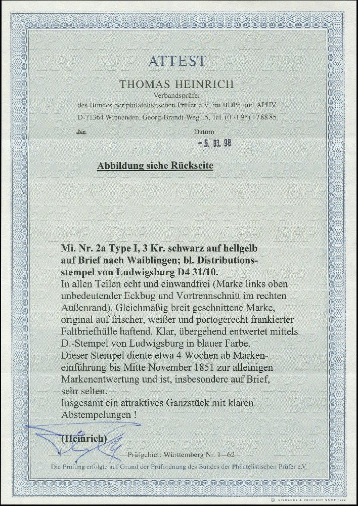| Prüfer: | Heinrich, Thomas (BPP (Bund Philatelistischer Prüfer)) |