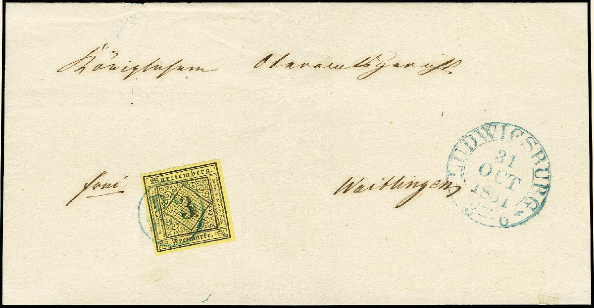 | Zusatzinformationen und Suchstichworte: | 368. Auktion Heinrich Köhler 26.-30. März 2019 Los 3552 LUDWIGSBURG: "D4 31/10", blauer Distributionsstempel klar und übergehend abgeschlagen auf 3 Kr. auf gelb, Type I, allseits breitrandig und farbfrisch auf Briefhülle mit sauber nebengesetztem großen blauen DKr. "LUDWIGSBURG 31 OCT. 1851" auf Briefhülle nach Waiblingen mit Ankunftsstempel vom nächsten Tag. Die Marke winziger Vortrennschnitt rechts oben außerhalb des Markenbildes sowie minimalster Eckknitter oben links, ebenfalls das Markenbild nicht berührend. Ein außerordentlich attraktiver und seltener Brief, Fotoattest Heinrich BPP (1998) Zuschlag 2.800,00 EUR |