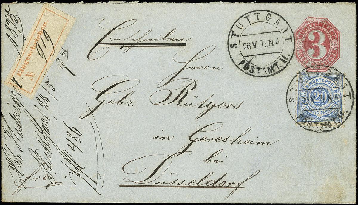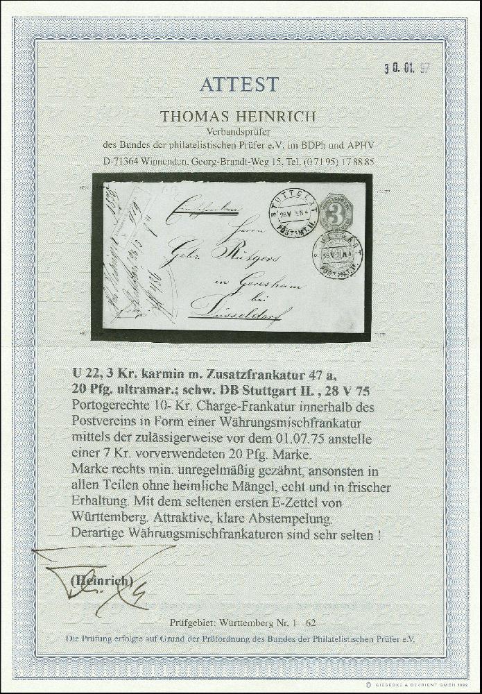 | Zusatzinformationen und Suchstichworte: | 368. Auktion Heinrich Köhler 26.-30. März 2019 Los 3558 1874, Umschlag 3 Kr. karmin in Währungs-Mischfrankatur mit vorverausgabter 20 Pfg. blau, farbfrisch und bis auf minimale Unregelmäßigkeit rechts gut gezähnt, mit DKr. "STUTTGART 28 V 75" als R-Brief mit erstem R-Zettel nach Düsseldorf mit Ankunftsstempel von Gersheim und privaten Absendervermerken vorne links und rückseitig; eine attraktive und seltene Kombination, Fotoattest Heinrich BPP (1997) Zuschlag 720,00 EUR |