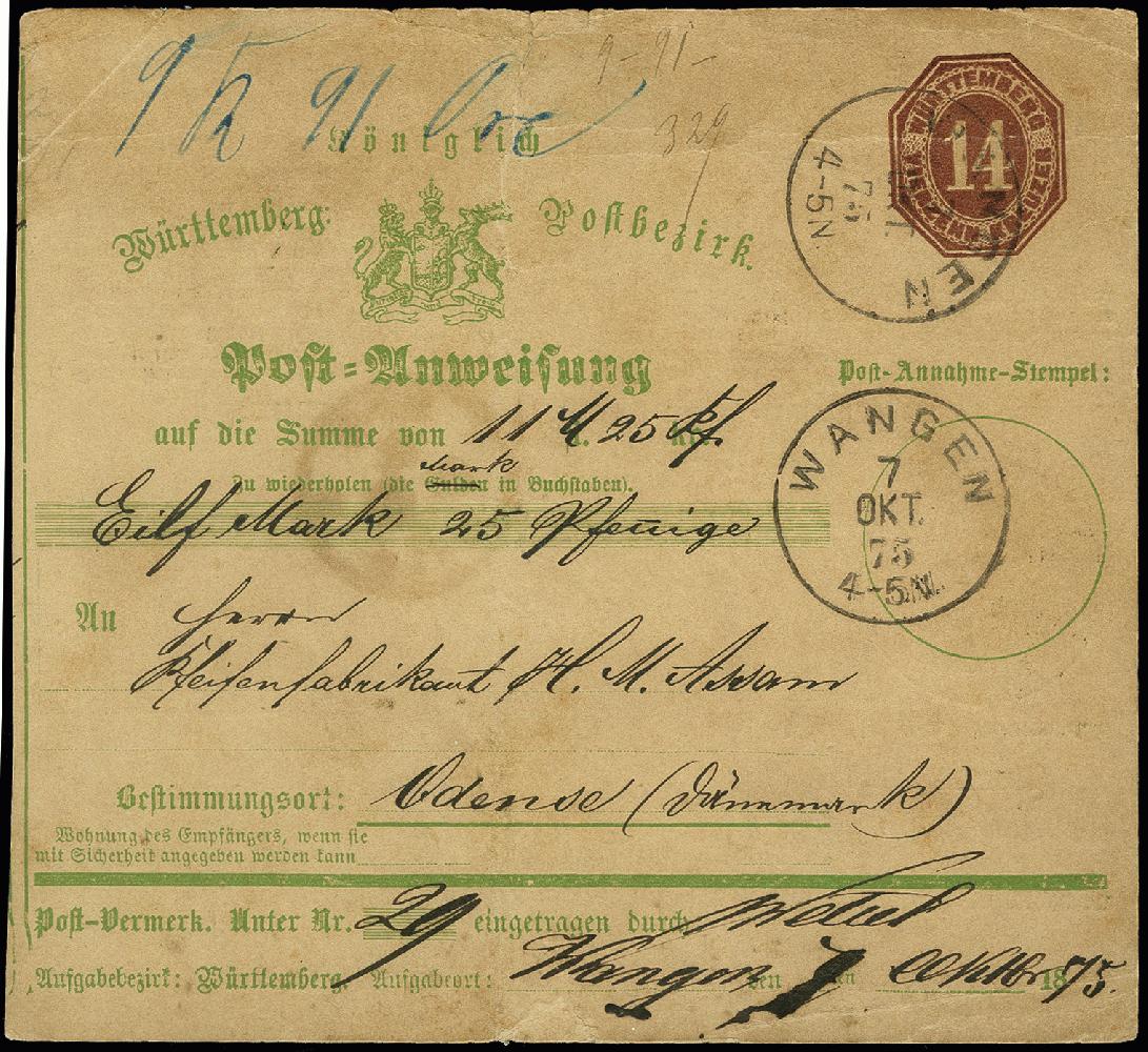 | Zusatzinformationen und Suchstichworte: | 368. Auktion Heinrich Köhler 26.-30. März 2019 Los 3560 1873, Postanweisungskarte 14 Kr. gebraucht von "WANGEN 7.OKT.75" als Auslandspostanweisung über 11 M.25 Pfg. via Kiel nach Odense, Dänemark mit Ankunftsstempel, Formular oben mit Einriss und übliche Beförderungs- und Faltspuren im Rand, sonst in guter Bedarfserhaltung, portogerechte Verwendung mit der Mindestgebühr von umgerechnet 40 Pfg., äußerst seltene Verwendung aus der Aufbrauchszeit, ausführliches Fotoattest Irtenkauf BPP (2004) Zuschlag 900,00 EUR |