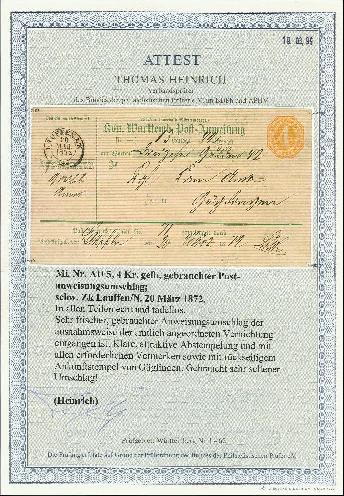 | Zusatzinformationen und Suchstichworte: | 368. Auktion Heinrich Köhler 26.-30. März 2019 Los 3563 Postanweisungsumschlag 4 Kr. gelb über 13 G. 42 Kr. gebraucht von "LAUFFEN A/N 20.MAR.1872" nach Güglingen mit Ankunftstempel in tadelloser Erhaltungt, gebrauchte Umschläge sind sehr selten, Fotoattest Heinrich BPP (1999) Zuschlag 450,00 EUR |