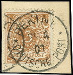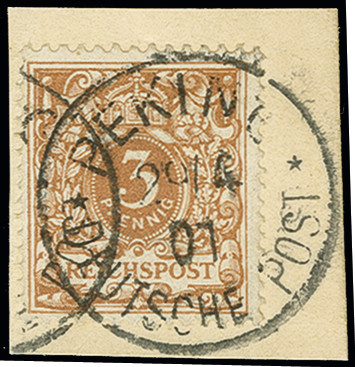 | Zusatzinformationen und Suchstichworte: | 368. Auktion Heinrich Köhler 26.-30. März 2019 Los 1534 Krone/Adler: 3 Pfg. hellockerbraun, farbfrisch mit Stempel "PEKING DP 29.4.01" auf Briefstück, tadellos, Fotoattest Jäschke-L. BPP (2019) (Mi. 800,-) Zuschlag 240,00 EUR |