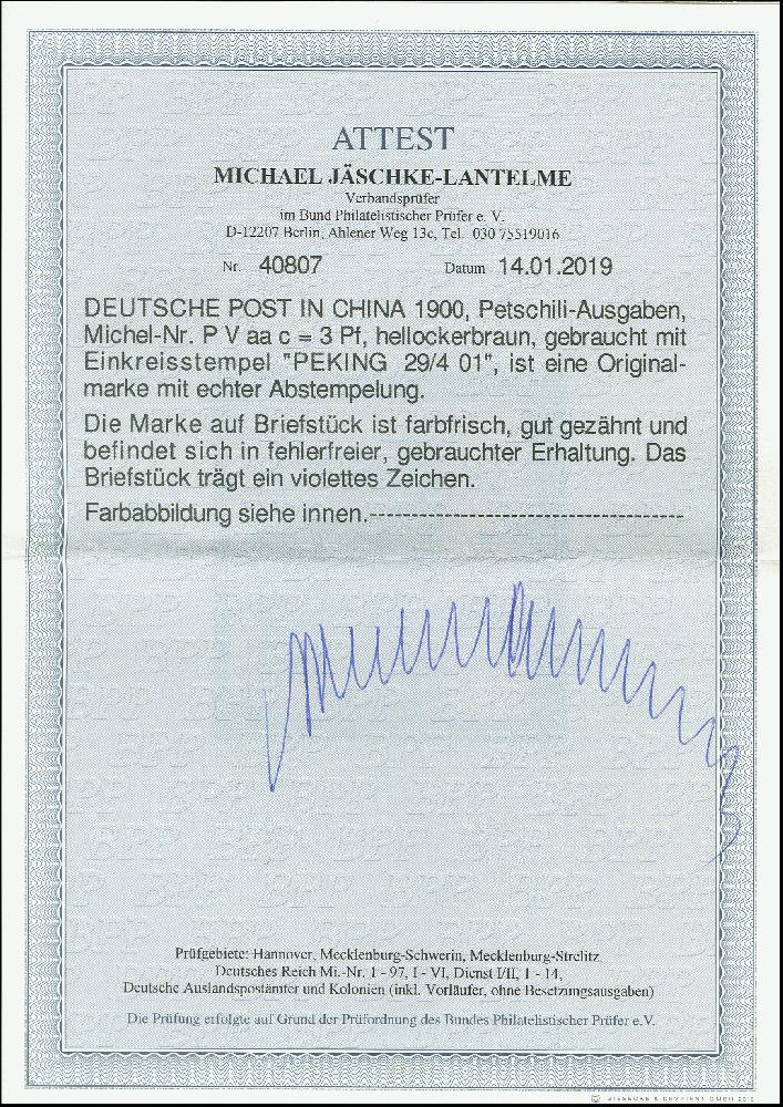 | Prüfgebiet: | Deutsche Auslandspostämter China Petschili-Ausgaben |