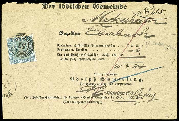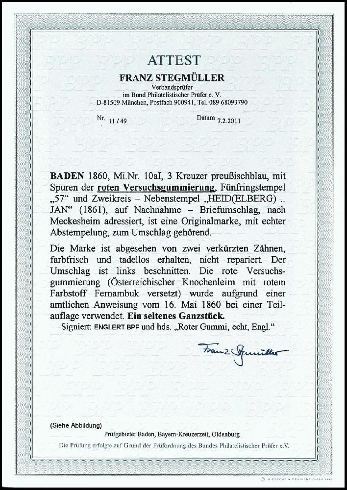| Zusatzinformationen und Suchstichworte: | Dr. Reinhard Fischer 188. Auktion 1. - 3. September 2022 Los 1339 Altdeutschland Baden 3 Kreuzer preußischblau mit roter Versuchsgummierung, Einzelfrankatur auf Nachnahme-Briefumschlag von "HEIDELBERG JAN (1861)" nach Meckesheim, abgesehen von zwei verkürzten Zähnen ist die Marke in tadelloser Erhaltung, der Umschlag ist links beschnitten, Fotoattest Stegmüller BPP: "Ein seltenes Ganzstück.", Mi. 1.200.- Zuschlag 280,00 EUR |