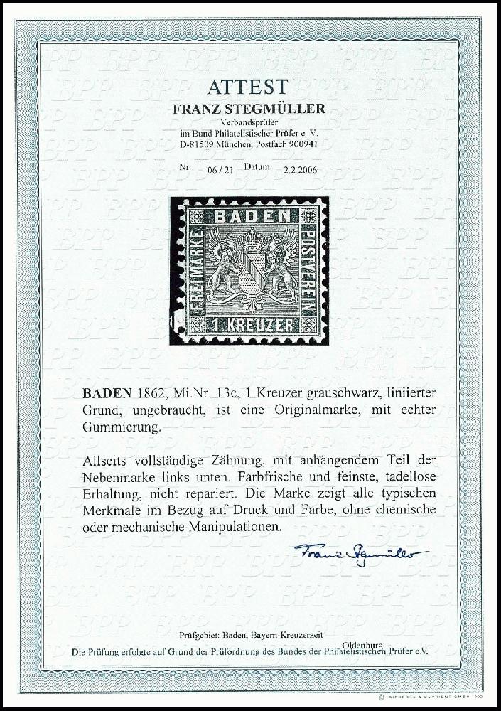 | Zusatzinformationen und Suchstichworte: | Dr. Reinhard Fischer 188. Auktion 1. - 3. September 2022 Los 1344 Altdeutschland Baden 1 Kreuzer grauschwarz, farbfrisches und vollzähniges Kabinettstück, ungebraucht mit Originalgummierung, sehr seltene Marke, Fotoattest Stegmüller BPP: "tadellose Erhaltung.", Mi. 1.000.- (unterbewertet) Zuschlag 1.300,00 EUR |
