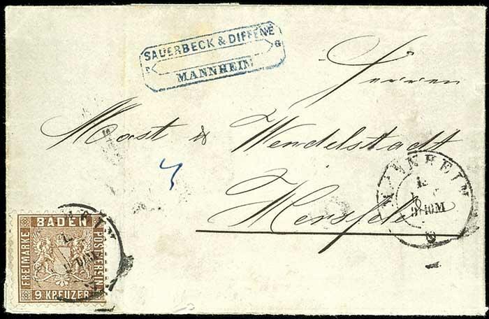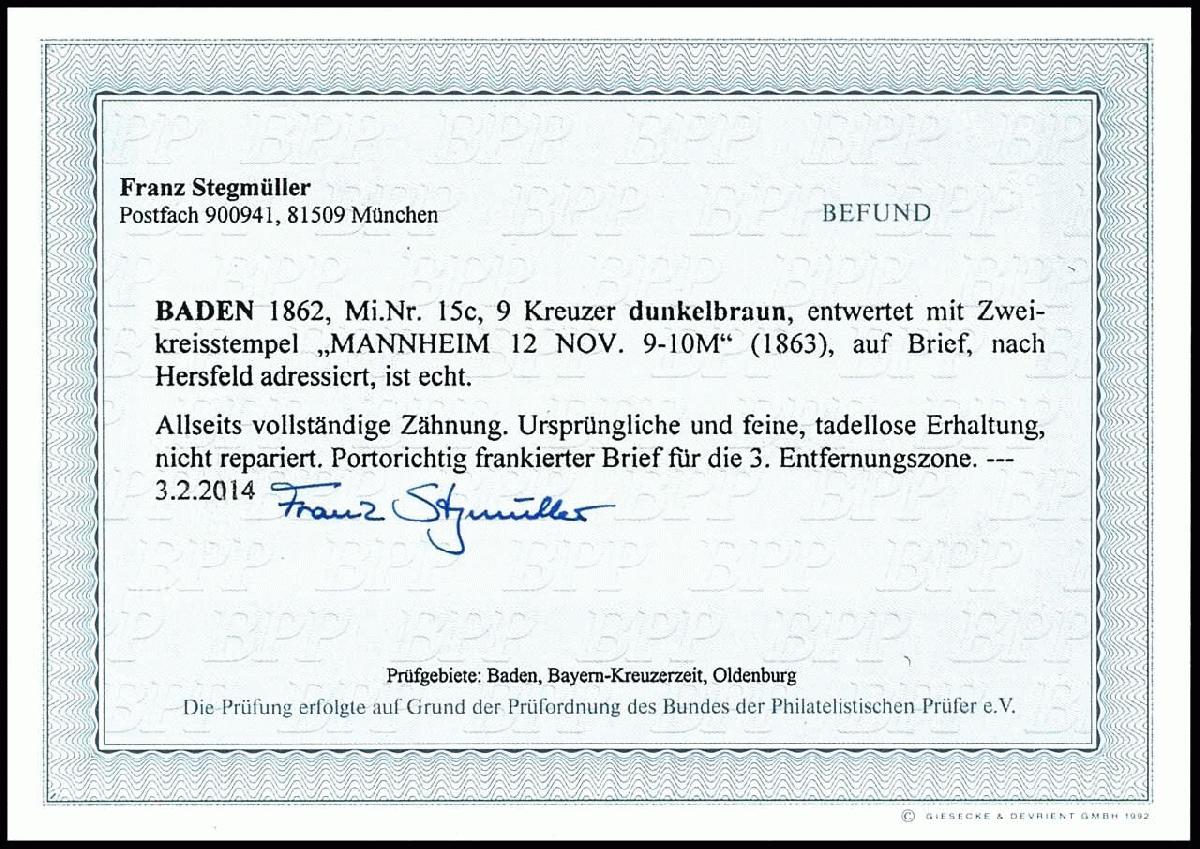 | Zusatzinformationen und Suchstichworte: | Dr. Reinhard Fischer 188. Auktion 1. - 3. September 2022 Los 1345 Altdeutschland Baden 9 Kreuzer dunkelbraun, vollzähniges und farbfrisches Kabinettstück als Einzelfrankatur auf Brief von "MANNHEIM 12 NOV." (1863) nach Hersfeld, portogerechte Frankatur für die 3. Entfernungszone, Fotobefund Stegmüller BPP (2014): "Ursprüngliche und feine, tadellose Erhaltung.", Mi. 750.- Ausruf 220,00 EUR |