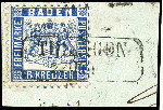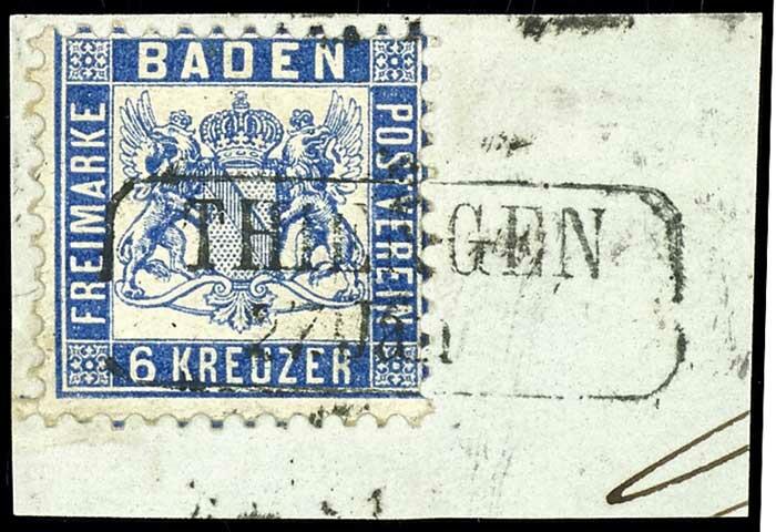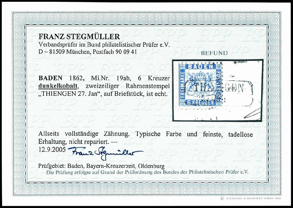| Zusatzinformationen und Suchstichworte: | Dr. Reinhard Fischer 188. Auktion 1. - 3. September 2022 Los 1350 Altdeutschland Baden 7 Kreuzer dunkelkobalt, farbfrisches und vollzähniges Luxusstück der seltenen Marke mit klarer Entwertung durch Ra2 "THIENGEN 27. Jan" auf Briefstück, Fotobefund Stegmüller BPP: "Allseits vollständige Zähnung. Typische leuchtende Farbe und feinste, tadellose Erhaltung, nicht repariert.", Mi. 750.- - eine in dieser Qualität kaum einmal angebotene Marke! Ausruf 300,00 EUR |