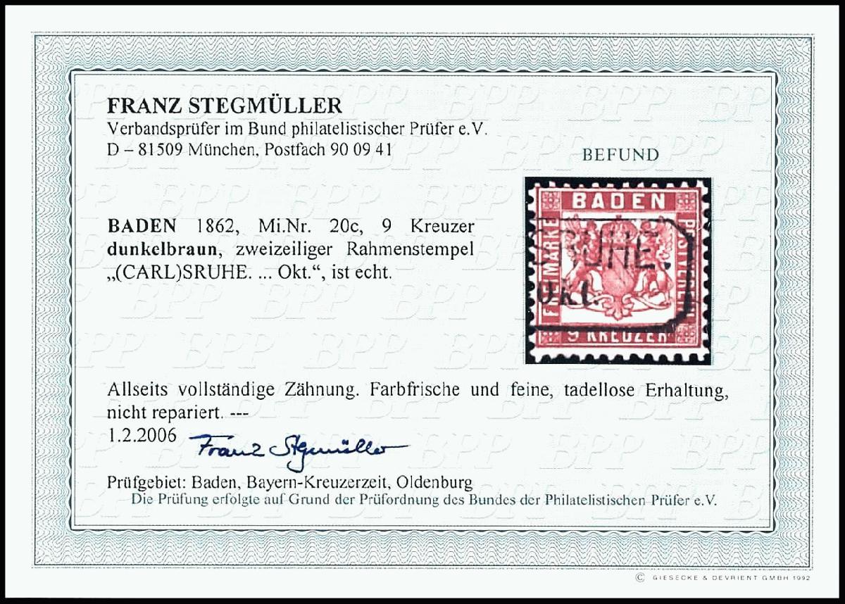 | Zusatzinformationen und Suchstichworte: | Dr. Reinhard Fischer 188. Auktion 1. - 3. September 2022 Los 1354 Altdeutschland Baden 9 Kreuzer Wappen, dunkelbraun, zentrisch entwertet mit Ra2 "(Carl)sruhe", tieffarbiges und vollzähniges Kabinettstück, Fotobefund Stegmüller BPP:: "feine, tadellose Erhaltung.", Mi. 600.- Zuschlag 220,00 EUR |