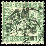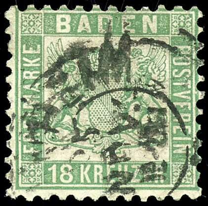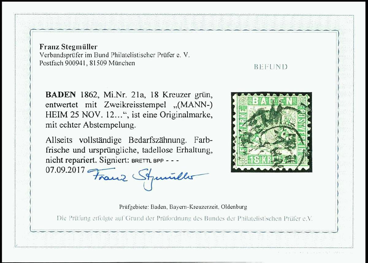 | Zusatzinformationen und Suchstichworte: | Dr. Reinhard Fischer 188. Auktion 1. - 3. September 2022 Los 1356 Altdeutschland Baden 18 Kr. grün, gestempelt K2 "MANNHEIM 25. NOV.", vollständige Zähnung, tadellose Erhaltung, Kabinett, gepr., Brettl BPP mit Fotobefund und Fotobefund Stegmüller BPP "Allseits vollständige Bedarfszähnung. Farbfrische und ursprüngliche, tadellose Erhaltung. Nicht repariert.", Mi. 700.- Ausruf 220,00 EUR |