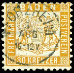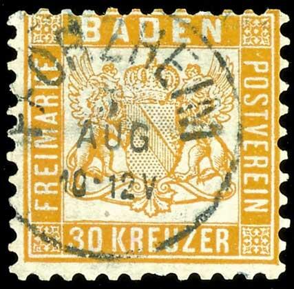 | Zusatzinformationen und Suchstichworte: | Dr. Reinhard Fischer 188. Auktion 1. - 3. September 2022 Los 1359 Altdeutschland Baden 30 Kr gelborange, klarer K1 PFORZHEIM 5 AUG, Fotobefund Stegmüller BPP: "echt, nur unten 1 Zahn verkürzt, dünne Stelle, farbfrische Erhaltung", Mi. 3.200,- Ausruf 300,00 EUR |