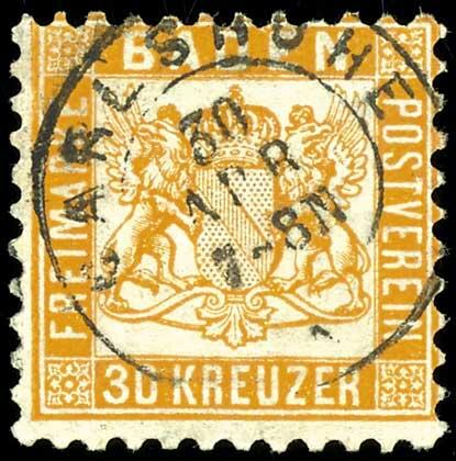 | Zusatzinformationen und Suchstichworte: | Dr. Reinhard Fischer 188. Auktion 1. - 3. September 2022 Los 1361 Altdeutschland Baden 30 Kr. Wappen lebhaftgelborange, zentrisch gestempelt K2 "CARLSRUHE 30 APR", rechts und unten gut gezähnt, oben ein Fehlzahn, links oben kleine Randergänzung, farbfrisches und attraktiv gestempeltes Stück der echt verwendet seltenen Marke, gepr. Richterund Fotobefund Stegmüller BPP: "Kontrastreiche Abstempelung und farbfrische Gesamterhaltung.", Mi. 3.000.- Zuschlag 260,00 EUR |