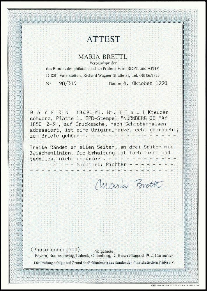 | Zusatzinformationen und Suchstichworte: | Dr. Reinhard Fischer 188. Auktion 1. - 3. September 2022 Los 1481 Altdeutschland Bayern 1 Kreuzer schwarz, Platte I, breitrandiges und farbfrisches Kabinettstück auf Drucksache mit Ortsstempelentwertung "NÜRNBERG 20 MAY 1850 2-3", adressiert nach Schrobenhausen, gepr. Richter und Fotoattest Brettl BPP: "Die Erhaltung ist farbfrisch und tadellos, nicht repariert.", ex Sammlung Höffen Zuschlag 3.700,00 EUR |