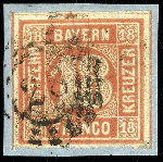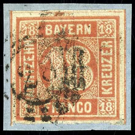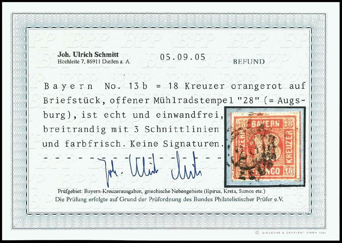 | Zusatzinformationen und Suchstichworte: | Dr. Reinhard Fischer 188. Auktion 1. - 3. September 2022 Los 1485 Altdeutschland Bayern 18 Kreuzer orangerot, breitrandiges (3 Schnittlinien) und farbfrisches Kabinettstück, entwertet mit offenem Mühlradstempel "28" (Augsburg) auf Briefstück, Fotobefund Schmitt BPP, Mi. 600.-, ex Sammlung Höffen Zuschlag 140,00 EUR |