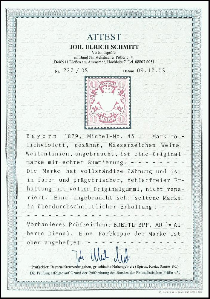 | Zusatzinformationen und Suchstichworte: | Dr. Reinhard Fischer 188. Auktion 1. - 3. September 2022 Los 1493 Altdeutschland Bayern 1 Mark rötlichviolett, ungebraucht mit Originalgummierung, geprüft Brettl BPP, Fotoattest Schmitt BPP "eine ungebraucht sehr seltene Marke in überdurchschnittlicher Erhaltung", Mi. 2.500.-, Zuschlag 168. Auktion = 1.000.-, Zuschlag 1.600,00 EUR |