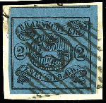 | Zusatzinformationen und Suchstichworte: | Dr. Reinhard Fischer 188. Auktion 1. - 3. September 2022 Los 1532 Altdeutschland Braunschweig 2 Silbergroschen schwarz auf hellblau, farbfrisches und voll- bis überrandiges Kabinettstück, entwertet mit Nummernstempel "8." (Braunschweig) auf Briefstück, Fotobefund Lange BPP: "echt und einwandfrei", Mi. 200.-++ Ausruf 70,00 EUR |