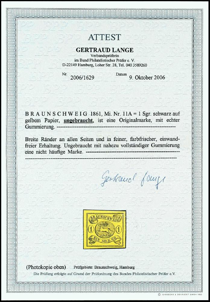 | Zusatzinformationen und Suchstichworte: | Dr. Reinhard Fischer 188. Auktion 1. - 3. September 2022 Los 1539 Altdeutschland Braunschweig 1 Silbergroschen schwarz auf gelbem Papier, farbfrisches und breitrandiges Luxusstück,. ungebraucht mit nahezu vollständiger Originalgummierung, Fotoattest Lange BPP: "in feiner, farbfrischer, einwandfreier Erhaltung. Ungebraucht eine nicht häufige Marke.", Mi. 550.- - ein durch makellose farbfrisches überzeugendes Qualitätsstück dieser Marke! Ausruf 180,00 EUR |