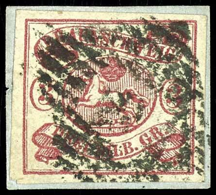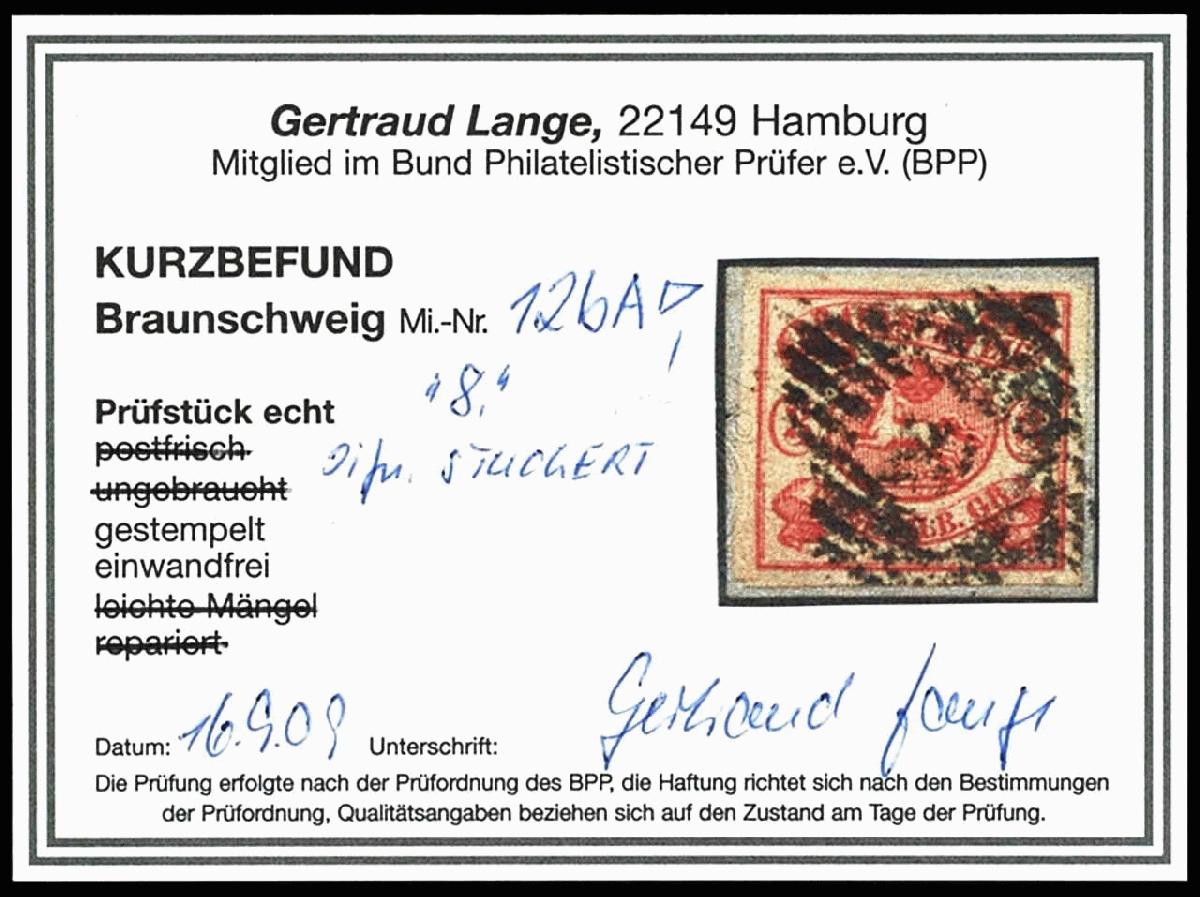 | Zusatzinformationen und Suchstichworte: | Dr. Reinhard Fischer 188. Auktion 1. - 3. September 2022 Los 1541 Altdeutschland Braunschweig 3 Silbergroschen karmin auf weiß, voll- bis überrandiges und farbfrisches Kabinettstück, klar und zentrisch entwertet mit Nummernstempel "8." - Braunschweig auf Briefstück, Fotobefund Lange BPP: "einwandfrei", Mi. 350.- Ausruf 90,00 EUR |