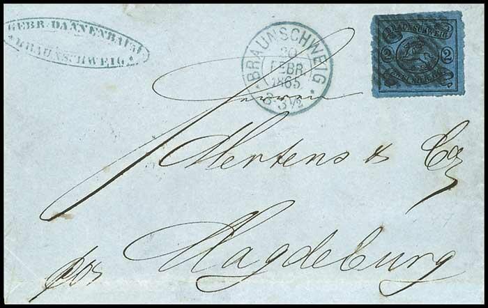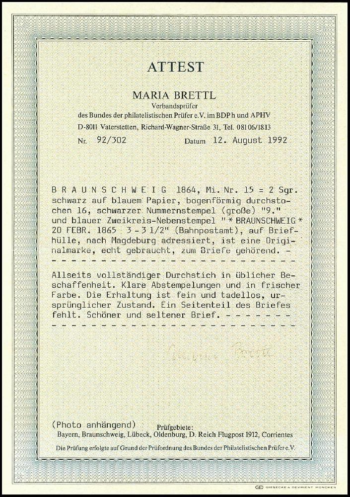 | Zusatzinformationen und Suchstichworte: | Dr. Reinhard Fischer 188. Auktion 1. - 3. September 2022 Los 1543 Altdeutschland Braunschweig 2 Silbergroschen blau, bogenförmig durchstochen 16, farbfrisches und tadellos durchstochenes Luxusstück als Einzelfrankatur auf Brief (rs. fehlt ein Seitenteil) nach Magdeburg, nebengesetzt Orts K2 "Braunschweig 20 Febr 1865", Marke entwertet mit Nummernstempel große "9", ein schöner und zugleich seltener Brief, Fotoattest Brettl BPP Ausruf 350,00 EUR |