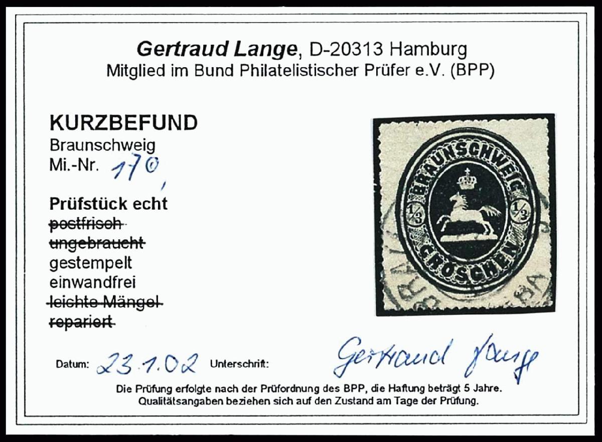 | Zusatzinformationen und Suchstichworte: | Dr. Reinhard Fischer 188. Auktion 1. - 3. September 2022 Los 1544 Altdeutschland Braunschweig 1/2 Groschen schwarz, farbfrisches und tadellos durchstochenes Kabinettstück, entwertet mit schwarzem K2 "Braunschweig", eine in einwandfreier Erhaltung stets unterschätzte Marke, Fotobefund Lange BPP: "echt und einwandfrei", Mi. 480.- (unterbewertet) Ausruf 80,00 EUR (Los zurückgezogen) |