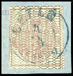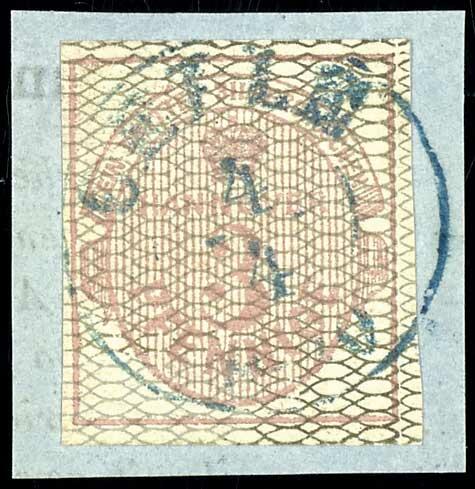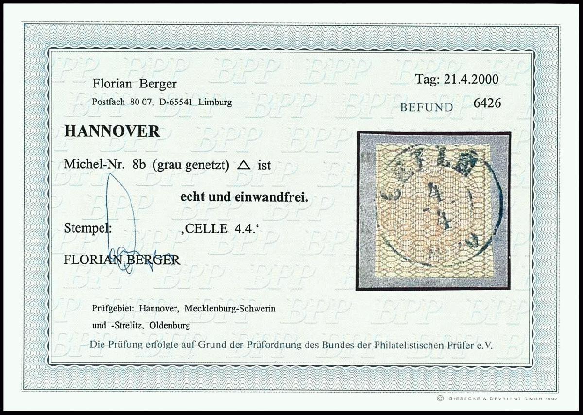 | Zusatzinformationen und Suchstichworte: | Dr. Reinhard Fischer 188. Auktion 1. - 3. September 2022 Los 1552 Altdeutschland Hannover 3 Pfennige lebhaftrötlichkarmin auf grau, vollrandiges und farbfrisches Kabinettstück, entwertet mit zentrisch abgeschlagenen blauem K2 "Celle 4/4" auf Briefstück, Fotobefund Berger BPP: "echt und einwandfrei", Mi. 450.-, Ausruf 140,00 EUR |