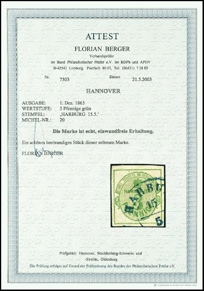 | Zusatzinformationen und Suchstichworte: | Dr. Reinhard Fischer 188. Auktion 1. - 3. September 2022 Los 1560 Altdeutschland Hannover 3 Pfennige grün, breitrandiges und farbfrisches Luxusstück der seltenen Marke, entwertet mit blauem K2 "HARBURG 15/5", Fotoattest Berger BPP: "Die Marke ist echt, einwandfreie Erhaltung.", Mi. 1.200.- Ausruf 450,00 EUR |