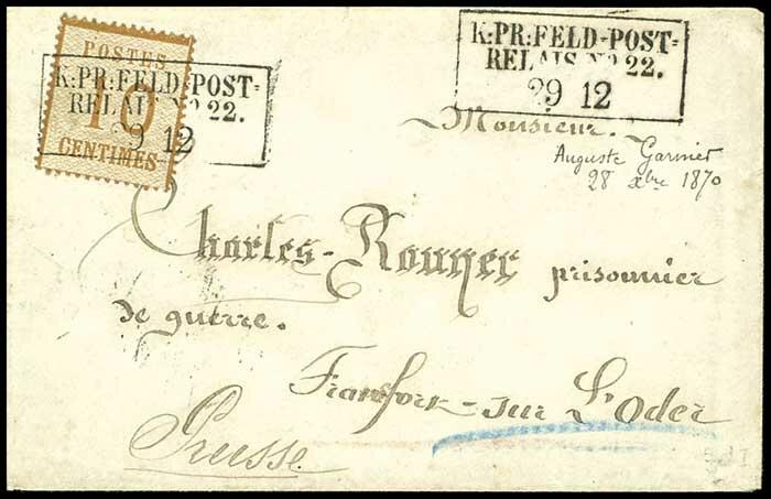 | Zusatzinformationen und Suchstichworte: | Dr. Reinhard Fischer 188. Auktion 1. - 3. September 2022 Los 1793 Altdeutschland NDP Elsass-Lothringen 10 C. ocker, Spitzen nach oben mit Ra 3 "K.Pr.FELD-POST-RELAIS No 22/29.12" auf portogerechtem Brief an einen französischen Kriegsgefangenen in Frankfurt/Oder, Fotokurzbefund Mehlmann BPP, ex Sammlung Höffen Zuschlag 110,00 EUR |