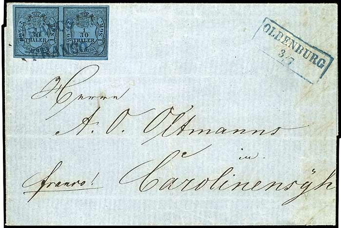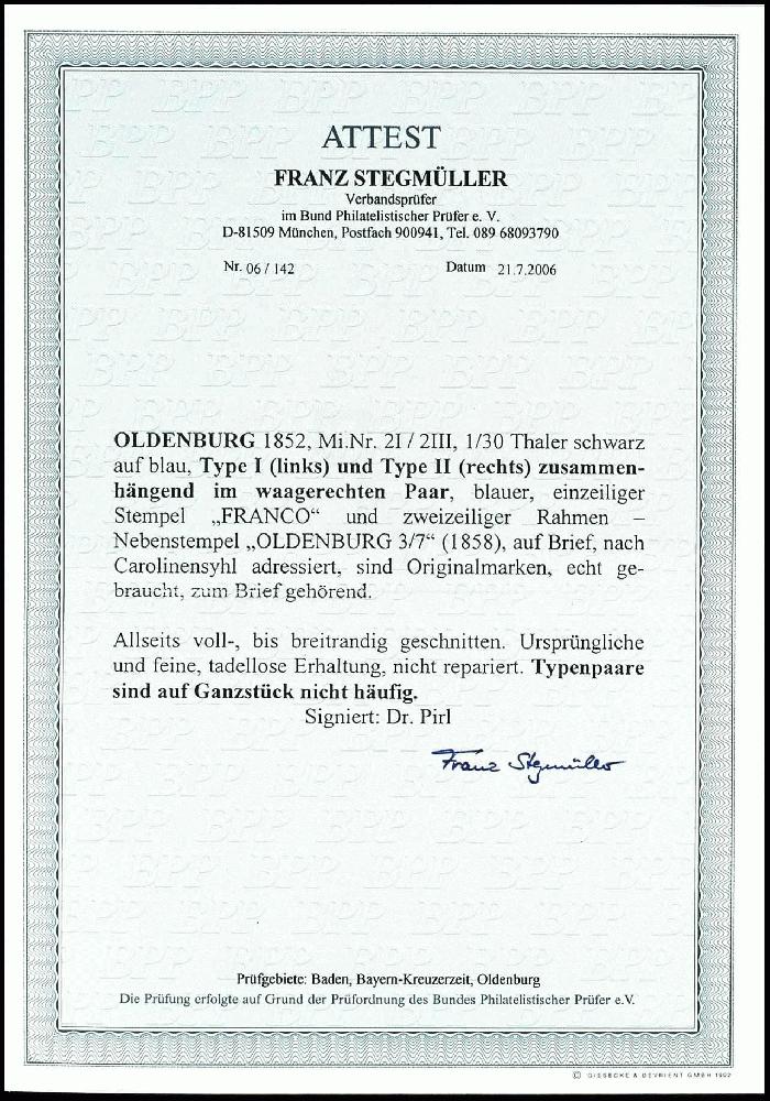 | Zusatzinformationen und Suchstichworte: | Dr. Reinhard Fischer 188. Auktion 1. - 3. September 2022 Los 1570 Altdeutschland Oldenburg 1/30 Thaler schwarz auf blau, waagerechtes Paar - linke Marke in Type I und rechte Marke in Type III, allseits breitrandig mit zwei blaue L1 (davon einer übergehend) auf Brief mit beigesetztem blauen Ra2 "Oldenburg 3/7" (1858) nach Carolinensyhl, Kabinett, Fotoattest Stegmüller BPP: "Ursprüngliche und feine, tadellose Erhaltung, nicht repariert. Typenpaare sind auf Glanzstück nicht häufig.", Mi. 1.500.-, ex Sammlung Höffen Ausruf 700,00 EUR |