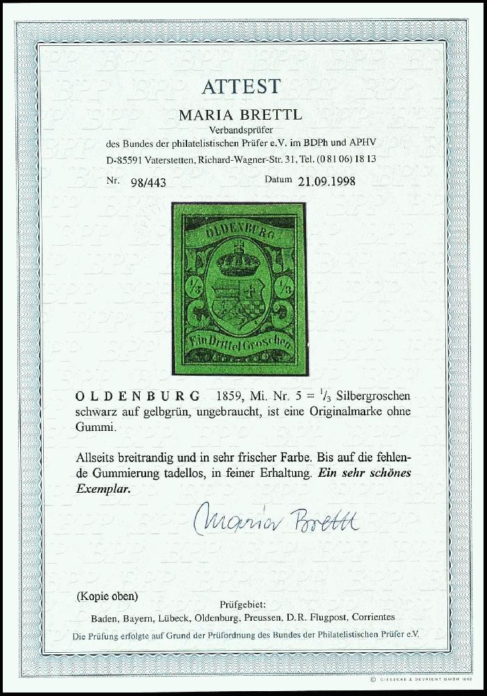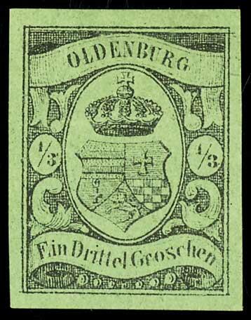 | Zusatzinformationen und Suchstichworte: | Dr. Reinhard Fischer 188. Auktion 1. - 3. September 2022 Los 1573 Altdeutschland Oldenburg 1/3 Groschen schwarz auf grün, tadellos ungebraucht ohne Gummierung, allseits sehr breitrandig geschnitten. Luxusstück! Fotoattest Brettl: "tadellos, ein sehr schönes Exemplar." Mi. 1.700.-, ex Sammlung Höffen Ausruf 700,00 EUR |