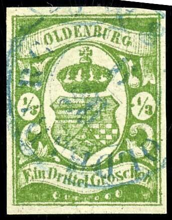 | Zusatzinformationen und Suchstichworte: | Dr. Reinhard Fischer 188. Auktion 1. - 3. September 2022 Los 1578 Altdeutschland Oldenburg 1/3 Groschen moosgrün, allseits breitrandiges Luxusstück in leuchtend frischer Farbe, entwertet mit zentrisch klar abgeschlagenem blauen K2 "Oldenburg", eine seltene Marke - zumal in dieser ausgesuchten Qualität, gepr. Drahn, W. Engel und Fotoattest Stegmüller BPP: "Ein sehr schönes Exemplar der seltenen Farbnuance" Ausruf 1.350,00 EUR (Los zurückgezogen) |