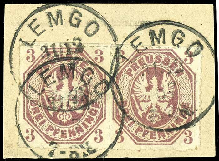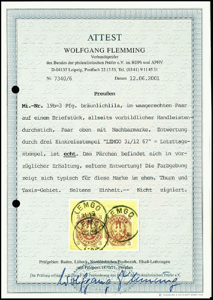 | Zusatzinformationen und Suchstichworte: | Dr. Reinhard Fischer 188. Auktion 1. - 3. September 2022 Los 1711 Altdeutschland Preussen 3 Pfg bräunlichlila, Adler im Achteck, waagerechtes Paar, farbfrisches und tadellos durchstochenes Kabinettstück, klar entwertet mit Letzttagsstempel "LEMGO 31 12 67" auf Briefstück, Fotoattest Flemming BPP: "vorzügliche Erhaltung. Seltene Einheit.", exSammlung Höffen Ausruf 320,00 EUR |