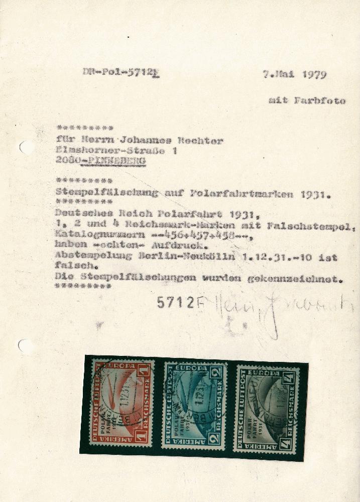 | Zusatzinformationen und Suchstichworte: | Stempelfälschung auf echten Polarfahrtmarken MiNr. 456 bis 458. Attest Kopie des Prüfers. |