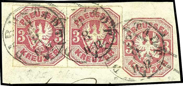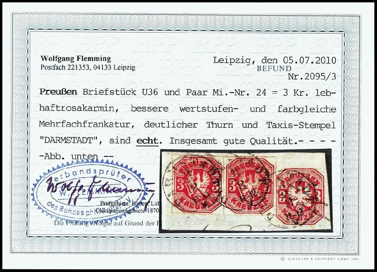 | Zusatzinformationen und Suchstichworte: | Dr. Reinhard Fischer 188. Auktion 1. - 3. September 2022 Los 1717 Altdeutschland Preussen 3 Kreuzer lebhaftrosakarmin, zwei Werte auf wertstufengleichen Ganzsachenteil U36, entwertet mit TuT-K1 "Darmstadt", gute Qualität, Fotobefund Flemming BPP Zuschlag 35,00 EUR |