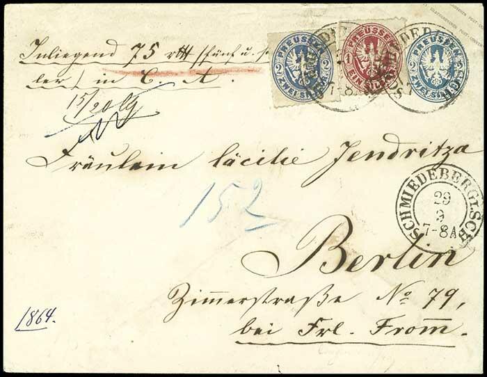 | Zusatzinformationen und Suchstichworte: | Dr. Reinhard Fischer 188. Auktion 1. - 3. September 2022 Los 1725 Altdeutschland Preussen 2 Silbergroschen Ganzsachenumschlag preußischblau mit Zufrankatur 2 Silbergroschen ultramarin und 1 Silbergroschen rosa als 5 Sgr. Porto für einen deklarierten Wertbrief von "Schmiedeberg i. Schlesien" nach Berlin, fünffach gesiegelt, gute Erhaltung, Fotoattest Flemming BPP: "Schöne Buntfrankatur." Ausruf 200,00 EUR |