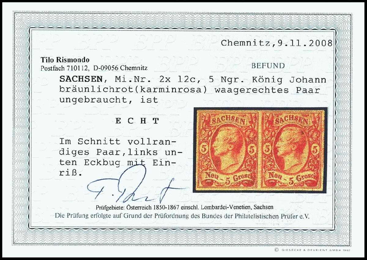 | Zusatzinformationen und Suchstichworte: | Dr. Reinhard Fischer 188. Auktion 1. - 3. September 2022 Los 1767 Altdeutschland Sachsen 5 Neugroschen König Johann, karminrosa, waagerechtes Paar, ungebraucht mit Originalgummierung, links unten Eckbug mit Einriss - sonst tadellos, Fotobefund Rismondo BPP, Mi. 1.200.-, ex Sammlung Höffen Ausruf 180,00 EUR |