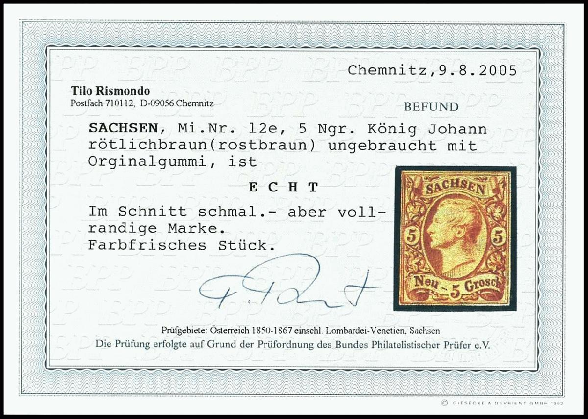 | Zusatzinformationen und Suchstichworte: | Dr. Reinhard Fischer 188. Auktion 1. - 3. September 2022 Los 1768 Altdeutschland Sachsen 5 Neugroschen König Johann, rötlichbraun (rostbraun), ungebraucht mit Originalgummierung, tadellos, Fotobefund Rismondo BPP: "Inm Schnitt schmal. - aber vollrandige Marke Farbfrisches Stück.", Mi. 900.-, ex Sammlung Höffen Zuschlag 400,00 EUR |