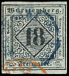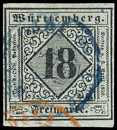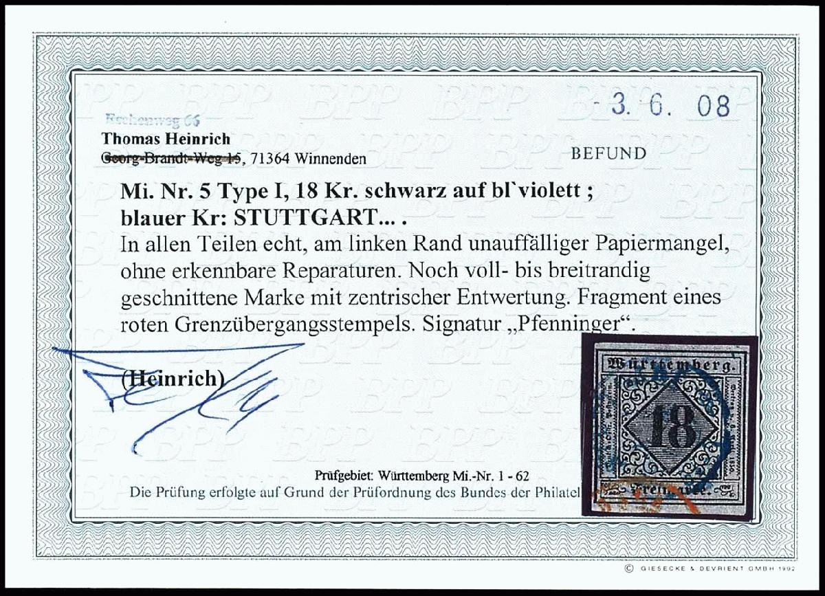| Zusatzinformationen und Suchstichworte: | Dr. Reinhard Fischer 188. Auktion 1. - 3. September 2022 Los 1387 Altdeutschland Württemberg 18 Kreuzer schwarz auf bläulichviolett, Type I, am linken Rand unauffälliger Papiermangel, ohne erkennbare Reparaturen, noch voll- bis breitrandiges Exemplar, entwertet mit blauem Ekr. "Stuttgart" sowie Fragment eines roten Grenzübergangsstempels, gepr.Pfenninger und Fotobefund Heinrich BPP, Mi. 900.- Zuschlag 240,00 EUR |