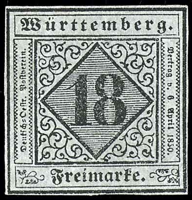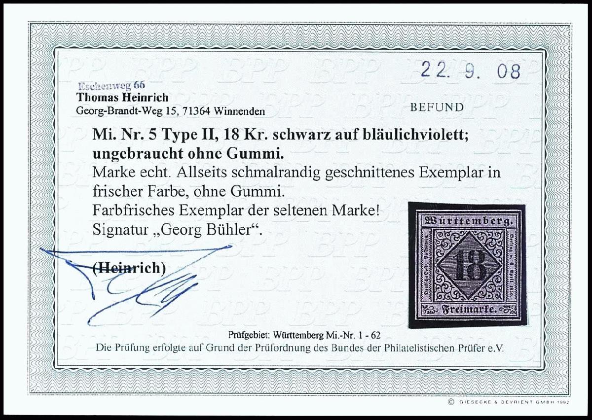 | Zusatzinformationen und Suchstichworte: | Dr. Reinhard Fischer 188. Auktion 1. - 3. September 2022 Los 1389 Altdeutschland Württemberg 18 Kreuzer schwarz auf bläulichviolett, Type II, ungebraucht ohne Gummierung, allseits schmalrandig geschnittenes Exemplar in frischer Farbe, gepr. Georg Bühler und Fotobefund Heinrich BPP: "Farbfrisches Exemplar der seltenen Marke!", Mi. für * 2.400.- Zuschlag 280,00 EUR |