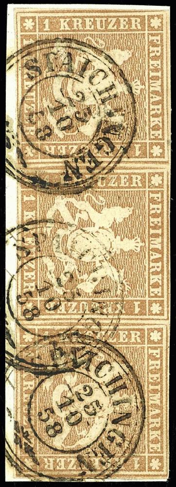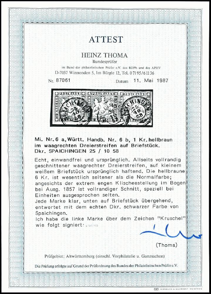 | Zusatzinformationen und Suchstichworte: | Dr. Reinhard Fischer 188. Auktion 1. - 3. September 2022 Los 1392 Altdeutschland Württemberg 1 Kr. hellbraun, waagerechter 3er-Streifen, allseits vollrandig, mit Dkr. "SPAICHINGEN 25/10/58" auf Briefstück, sign. Kruschel, Fotobefund Thoma BPP Zuschlag 340,00 EUR |