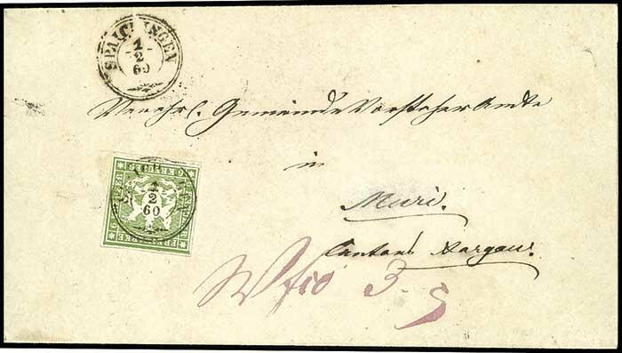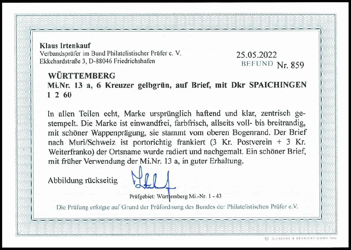 | Zusatzinformationen und Suchstichworte: | Dr. Reinhard Fischer 188. Auktion 1. - 3. September 2022 Los 1396 Altdeutschland Württemberg 6 Kr. gelbgrün, voll bis breitrandig vom oberen Bogenrand mit Dkr. "Spaichingen 1.2.60" nach Muri/Schweiz, der Ortsname wurde radiert und nachgemalt, dennoch schöner Brief mit früher Verwendung der Mi.-Nr. 13 a, Fotobefund Irtenkauf BPP Zuschlag 70,00 EUR |